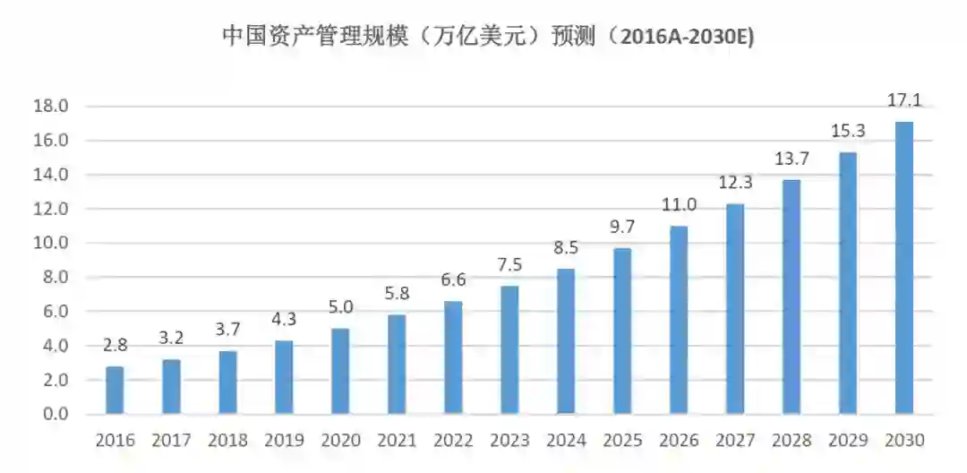 根据Casey Quirk的预测,至2019年中国将成为仅次于美国的第二大资产管理市场,2030年中国资管规模将从2016年的2.8万亿美元跃升至17万亿美元,CAGR 13.8%。随着中国资产管理业务规模的快速增长,对于投资科技的需求也将进一步释放。