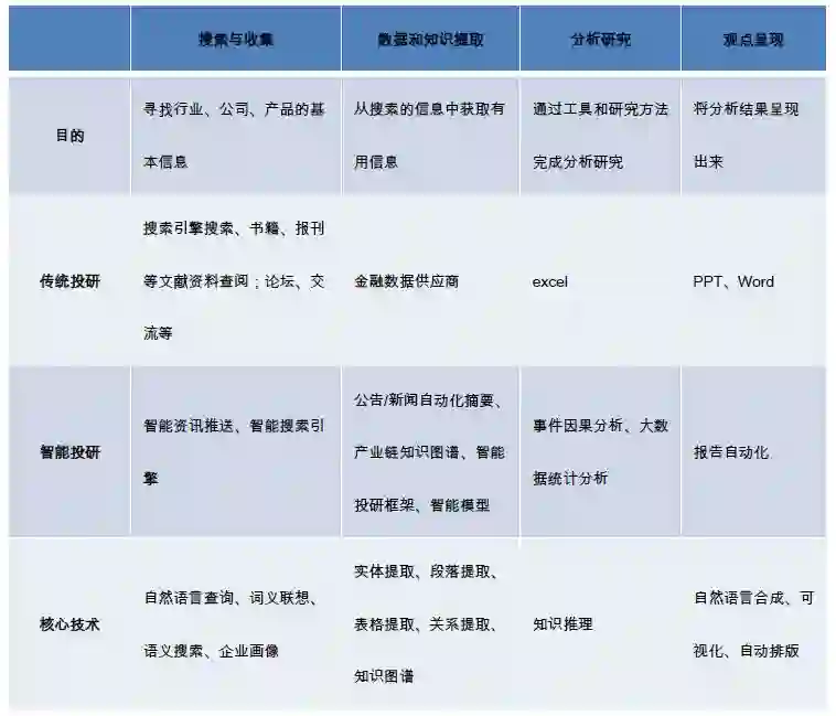 传统的投研过程包括信息搜索与收集、数据和知识提取、分析研究、观点呈现四个步骤。人工智能技术在每个步骤都有显著提升投研效率的可能性。