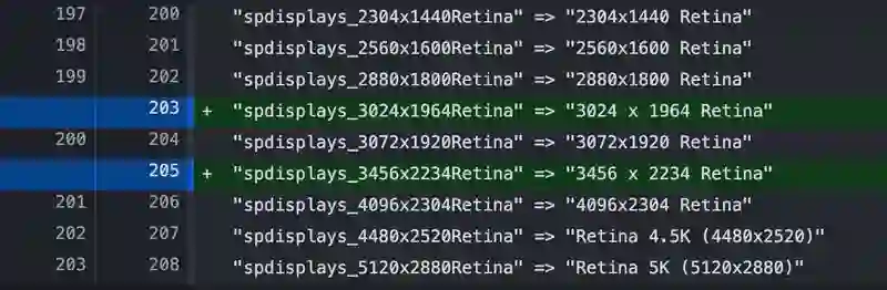 MacRumors 发现,该测试版出现了两个新的分辨率,分别是“3456 x 2234 Retina”和“3024 x 1964 Retina”,计算下来对应的像素密度大约为 250 ppi。