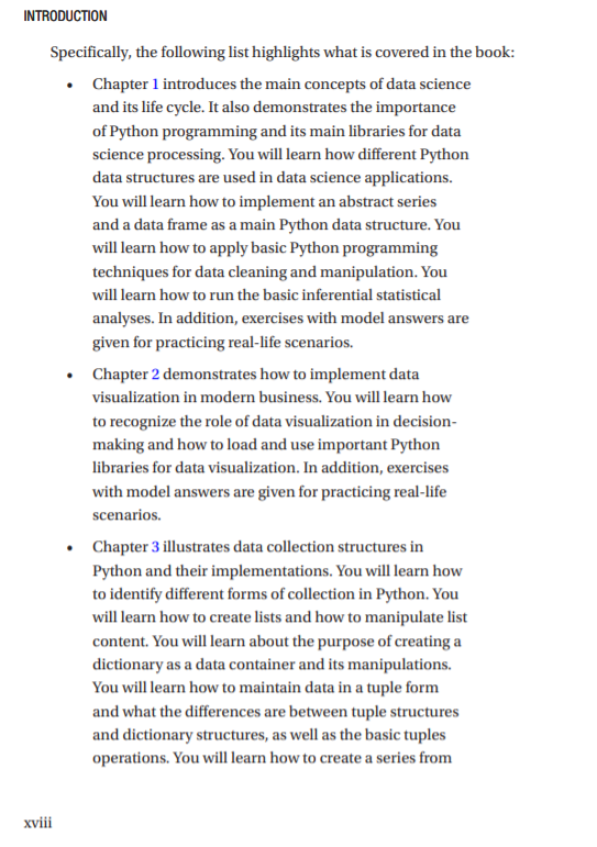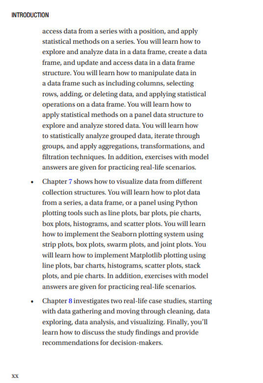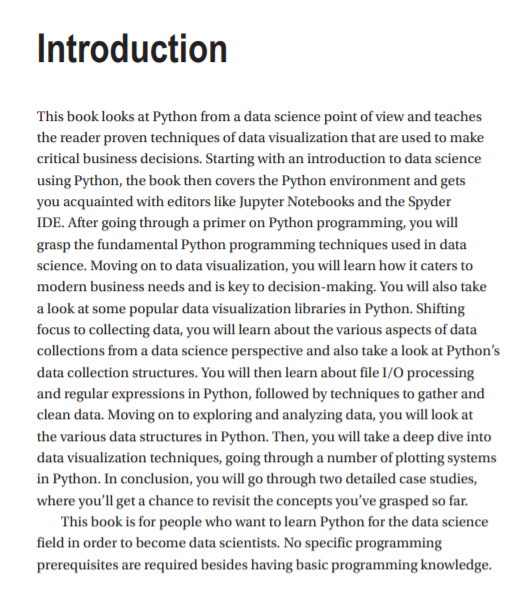 将重点转移到数据结构,您将从数据科学的角度了解数据结构的各个方面。然后使用Python处理文件I/O和正则表达式,然后收集和清理数据。继续探索和分析数据,您将看到Python中的高级数据结构。然后,您将深入研究数据可视化技术,了解Python中的许多绘图系统。