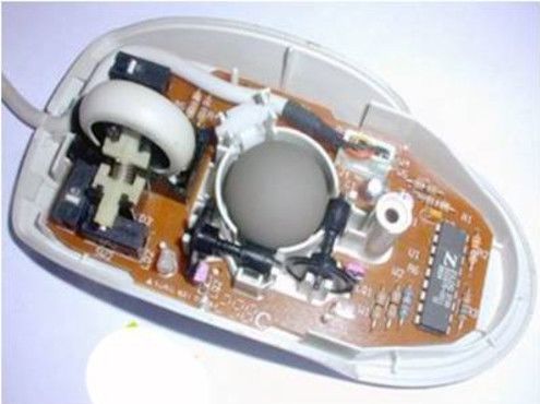 机械鼠标主要是由滚球、辊柱和光栅信号传感器组成的。它是通过移动鼠标,带动胶球,胶球滚动又磨擦鼠标内分管水平和垂直两个方向的栅轮滚轴,驱动栅轮转动。栅轮轮沿为格栅状。紧靠栅轮格栅两侧,一侧是一红外发光管,另一侧是红外接收组件。红外接收组件为一三端器件,其中包含甲乙两个红外接收管。在水平和垂直栅轮夹角正对方向有一压紧轮,它使胶球无论向何方向滚动都始终压紧在两个栅轮轴上。