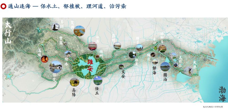 此外,通过构建衔接太行山脉——渤海湾、京南生态绿楔——拒马河——白洋淀生态廊道,提升区域生态安全保障。通过大规模植树造林,改善新区生态景观环境。通过就近、均布的公园、林荫道建设,提供卓越的休憩运动空间。