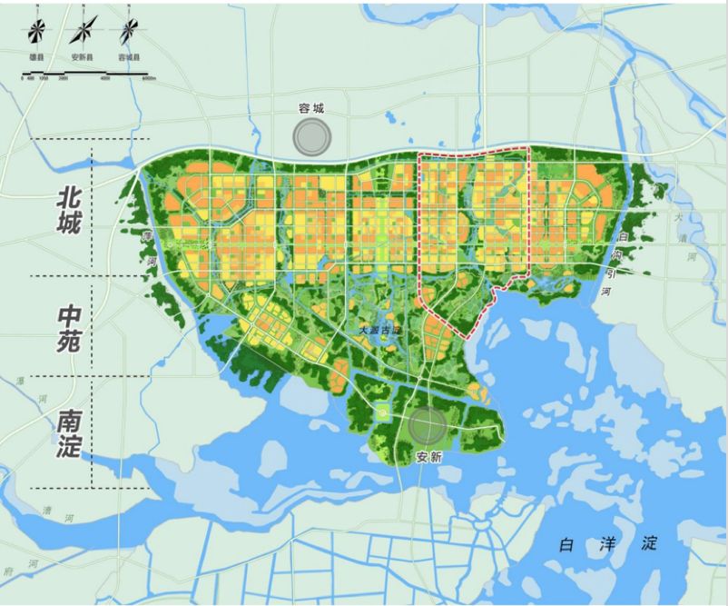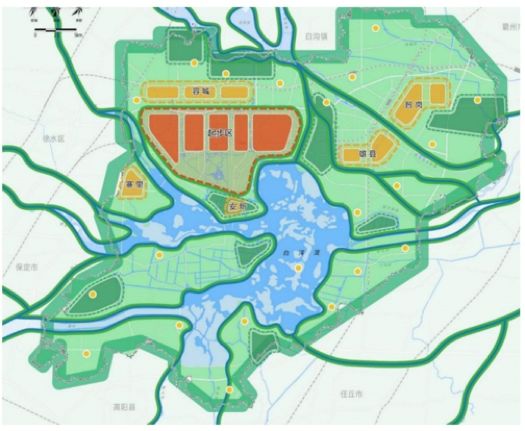 · 起步区结构——顺应自然、随形就势,综合考虑地形地貌、水文条件、生态环境等因素,科学布局城市建设组团,形成“北城、中苑、南淀”的总体空间格局。