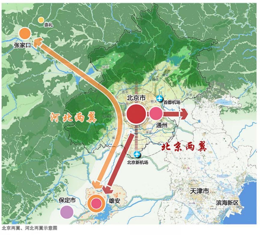 新区与北京副中心形成北京的两翼,新区规划与北京总规相衔接,错位协同发展,推动北京非首都功能和人口疏解,打造非首都功能疏解的高品质承载地。
