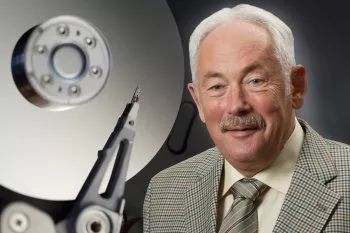Peter Grünberg先生,背景是他的GMR磁盘。