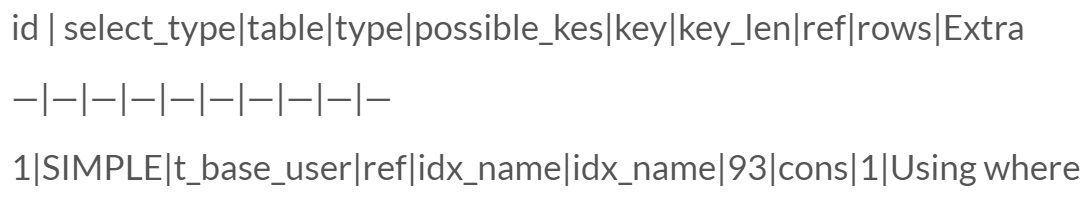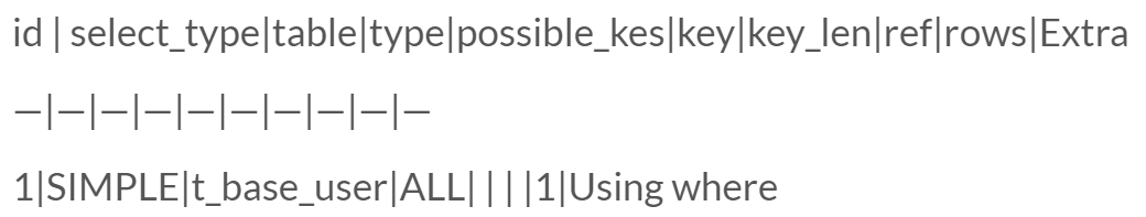 上面这个执行计划给到的信息是: 这个结果通过一个简单的语句全表扫描,共扫描1行,使用where条件在t_base_user表中筛选出的。发现该语句并没有走索引,为什么是这样的呢?别急,我们紧接着看下一节。