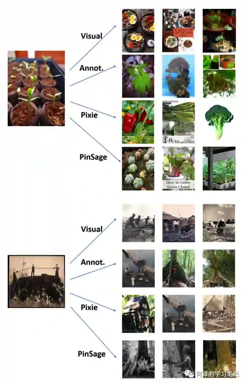 「负样本采样」:为了提高训练效率,作者为每个 mibi-batch 采样了 500 个负样本,即 mini-batch 中的样本共享这 500 个负样本。与单独为每个节点进行负采样相比,其结果几乎没有什么差异。对于这 500 个负样本来说,最简单的方法就是随便找 500 个样本,但是这样并不能体现出正负样本间的差异。为了解决这个问题,作者为每个正样本对设计了“硬性”的负样本。比如,对于每对训练样本 来说,强负样本为与查询项目 q 相关,但是与正样本 i 不相关的样本。强负样本主要来源为基于查询项 q 的个性化 Pagerank 得分,并对排名在 2000-5000 的项目中进行随机采样。下图分别展示了查询项、正样本、随机负样本、强负样本: