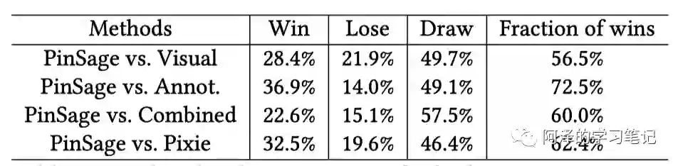 首先是 PinSAGE 与其他算法的相似度对比,胜率都在 50% 以上: