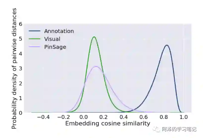 衡量 Embedding 有效性的另一个指标是:考虑随机的 Item 之间的相似度距离分分布比较广,如果所有节点对的距离大致相同则区分度不足。下图为不同模型的计算节点对相似度的概率密度函数,可以看到 PinSAGE 的相似度距离分布更加广泛: