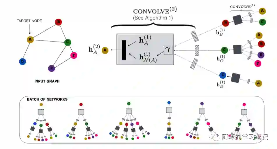 PinSAGE 使用的是两层局部卷积模块来生成节点的 Embedding。左上角为图示例,右边是一个两层的神经网络,用来计算节点 A 的 Embedding 向量。底部是节点的输入,每个节点具有不同的输入,但是共享神经网络的输入。
