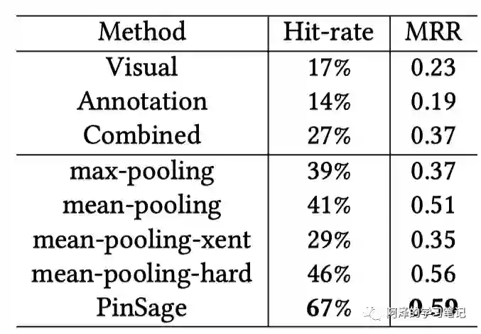 下图为 PinSAGE 和其他模型的命中率和 MRR,可以看到 PinSAGE 的命中率提高了 150%,MRR 提高了 60%。