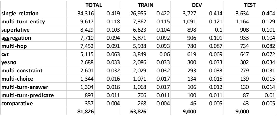 而MSParS基于微软的开放领域知识图谱Satori进行标注,目前发布的V1.0版本总共包含81,826条人工标注,每条数据由一个四元组构成:问题、语义表示、语义表示参数、问题类型。其中,语义表示参数是指在问题中出现的构成语义表示所需的实体名称、实体类型或数值等。问题类型则由9种单轮问题类型和3种多轮问题类型组成,包括单关系(single-relation)、多跳(multi-hop)、多约束(multi-constraint)、复合事件(CVT)、是非判断(yesno)、选择(multi-choice)、最高级(superlative)、数值比较(comparative)、聚集查询(aggregation)、前一轮问题实体省略(multi-turn-entity),前一轮问题谓词省略(multi-turn-predicate)和前一轮答案省略(multi-turn-answer)。