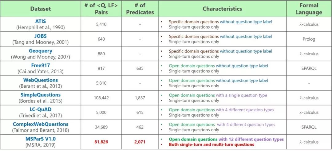 针对这些问题,微软亚洲研究院自然语言计算组与微软必应(Bing)搜索引擎团队合作构建并发布了一个大规模、高质量、多类型的语义分析数据集:MSParS (Multi-perspective Semantic ParSing Dataset),希望供科研人员和工业界同行进行研究和使用。该数据集(V1.0版本)包含了81,826个自然语言问题及其对应的结构化语义表示,覆盖12种不同的问题类型和2,071个知识图谱谓词,是学术界目前最全面的语义分析数据集。现在,MSParS V1.0版本已经可以通过GitHub进行下载。