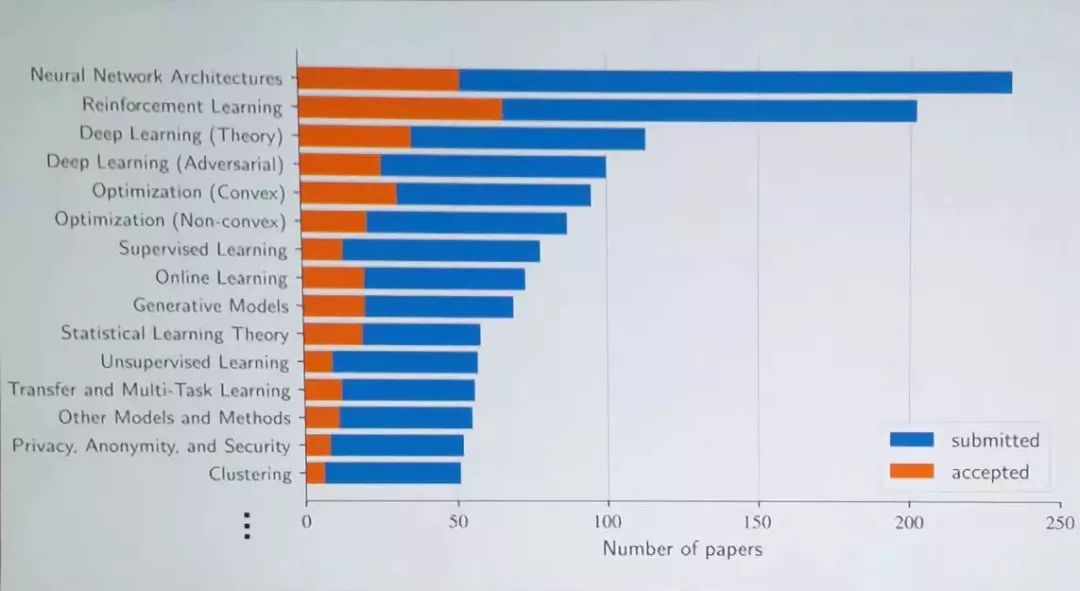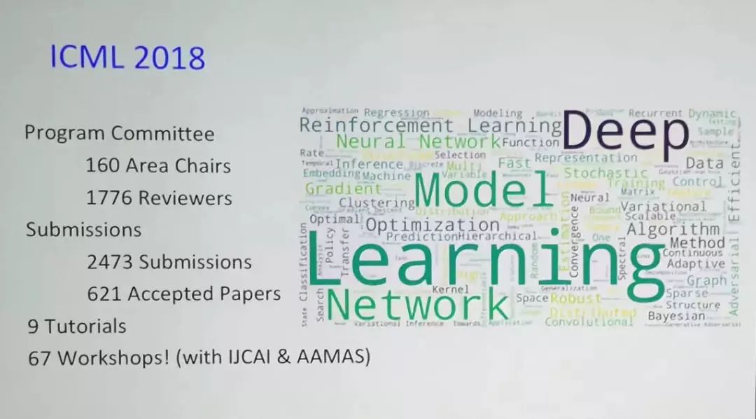 本届ICML的注册人数达到了5000余人,是ICML 2017的两倍以上。大会共收到投稿2473篇,比去年增长了45%,其中621篇被接收。来自神经网络结构和强化学习两个子领域的投稿数量最多,强化学习领域的接受率更高,其它热门方向还有深度学习、在线学习、统计学习、隐私安全等等。