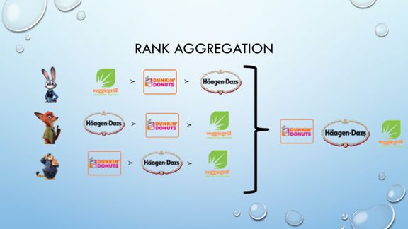 在一些场景下,为了实现更好的集体决策,我们需要根据人们对于一个选项集中不同选项的偏好来估计每一个选项的效用分布。例如下图的场景:Judy、Nick和Ben想要选一个吃饭的地方,他们对备选选项有不同的偏好,比如Judy最喜欢veggie grill,其次是dunkin’s donuts, 最后是哈根达斯。我们可以根据这三个人的偏好来估计出一个随机效用模型,然后根据估计的参数(即每个选项的效用分布)来帮他们选择一个餐馆。