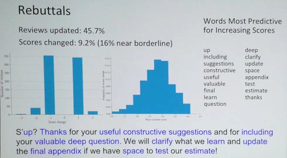对于有志于向ICML投稿的读者,我建议大家关注大会的反驳环节(rebuttal)。本次ICML的反驳环节促成了45%的审稿意见变更,最有利于提升审稿分数的关键词包括“深度”、“包括”、“澄清”、“建议”、“更新”、“有建设性的”、“有用的”、“有价值的”、“感谢”等等。如果把这些词连起来会变成如下的一句话:感谢您有用的建设性建议以及无价的有深度的问题。如果我们有测试我们估计结果的空间,我们会澄清我们的观测,并且更新最终的附录。这当然只是一个玩笑,但从中可以看出,我们在向审稿人提出反驳意见的时候一定要保持礼貌和理性。