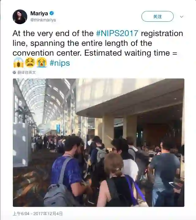 但是,NIPS 2017的火爆程度,明显超出了很多人的预期,Twitter网友Mariya拍到的NIPS签到注册的人群,已经从会议中心的一头排到了另一头,而她自己却排在这条长龙的最末端: