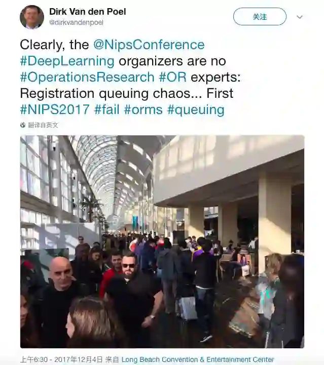 与此同时,另一位Twitter网友Dirk Van den Poel则开始抱怨这届大会的组织者明显没有大规模会议的组织经验,光是会前的注册排队就已经乱作一团了: