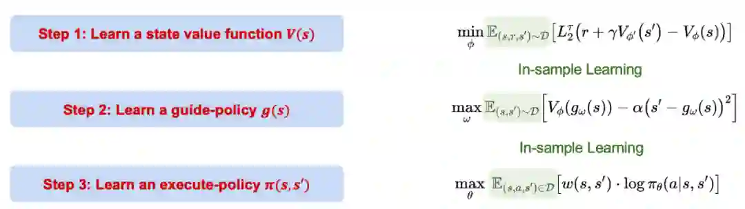 Policy-guided Offline RL (POR)的学习过程分为三步,这三步是分别解耦的,互不影响。值得注意的是,POR 全程都是基于 imitation-based 的学习,也就是样本内的学习(in-sample learning),不会对数据分布外的动作进行价值评估。