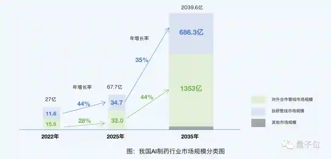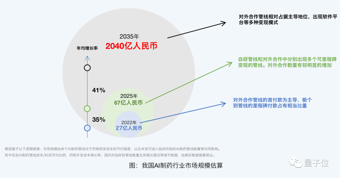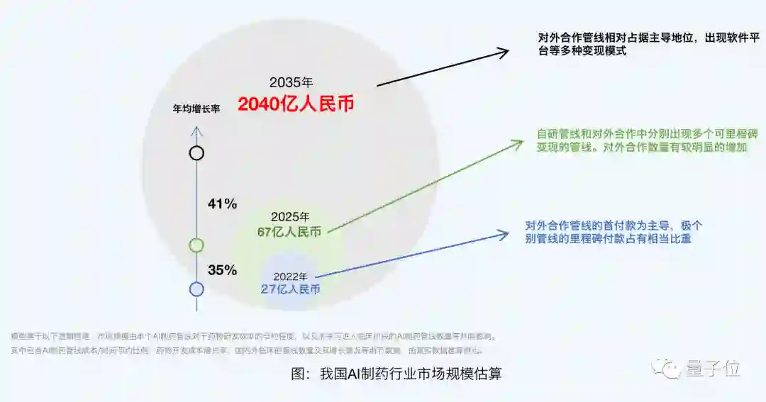 据量子位预测,2025年AI制药总市场规模将达到72亿元,原因是短期内,行业会保持一定增长率,但总体市场规模相对有限,且增长主要来源于合作管线带来的首付款价值、以及极少数头部管线的里程碑付款。