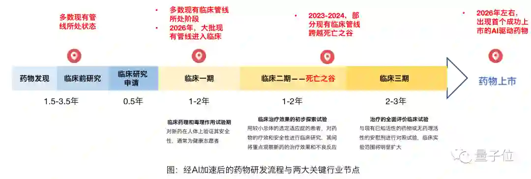 据量子位智库预测,鉴于目前绝大多数临床阶段管线处于临床一期,2023-2024年将出现跨越“死亡之谷”的临床管线,进一步证明AI技术对新药研发产业的颠覆性。