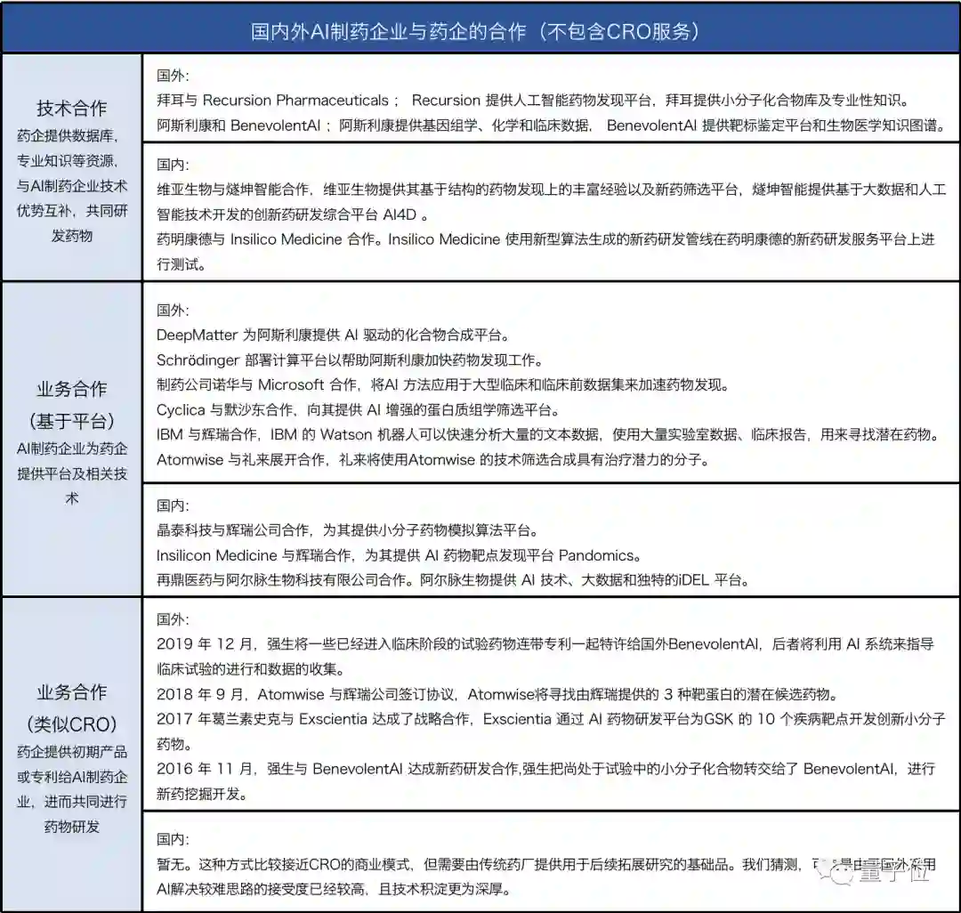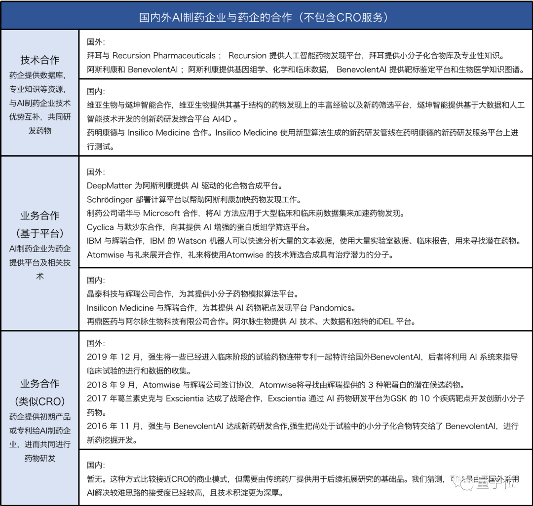 整体来看,AI制药强调企业与CRO(合同研究组织)之间的关系,类似“技术外包”的特殊角色。一方面,AI制药公司可以成为CRO,但其本身发展也需要CRO在各个环节上予以配合,因此,与CRO的关系将对AI制药公司的临床项目及商业化进程产生重大影响。