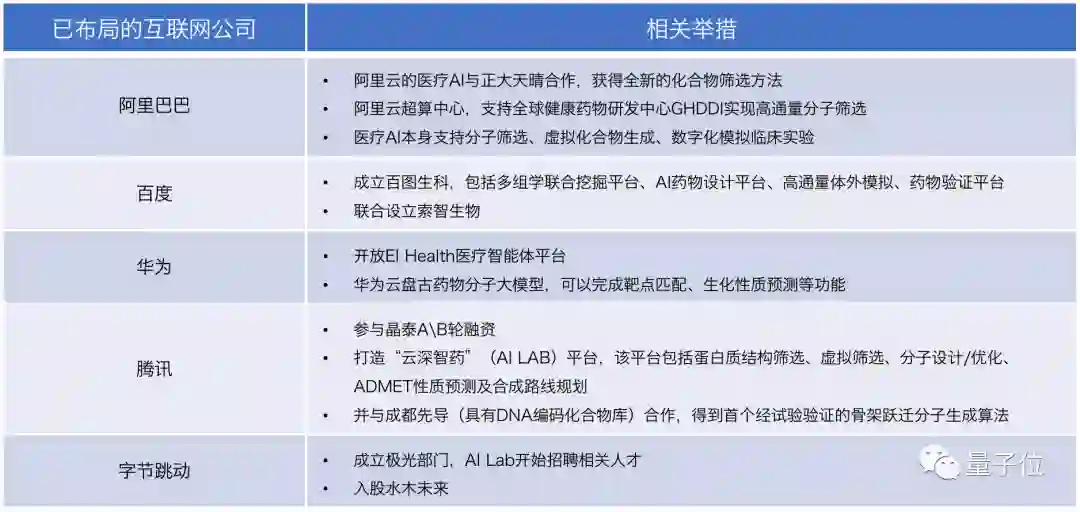 传统药厂主要通过自建团队、对外投资、CRO及技术合作等方式进入AI制药赛道;互联网公司多以对外投资、打造自有相关平台、提供算力及计算框架服务的方式成为玩家之一。