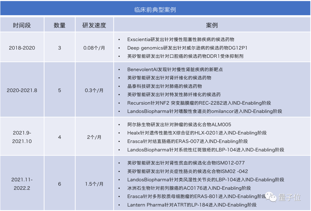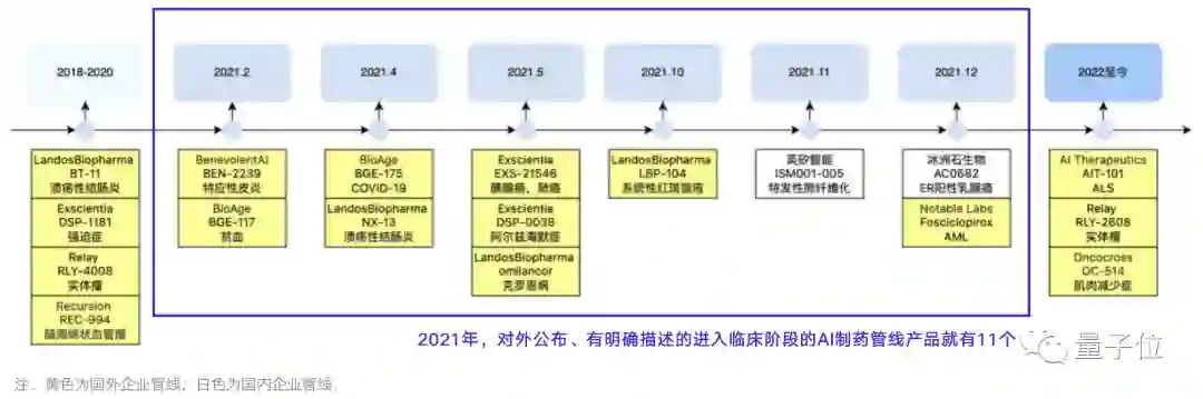 仅2021年,公开的临床阶段产品已达11个,远超以往数年积累;突破重点也从过往的新靶点/候选化合物转移到了IND-Enabling产品,侧面证实AI制药正在加速取得更多突破。