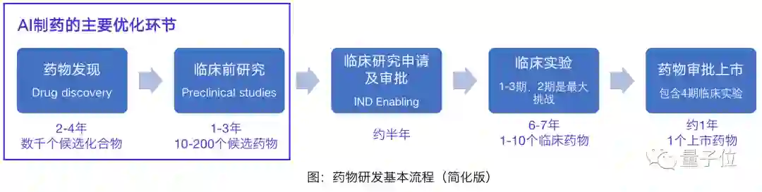 AI制药,主要优化的是新药研发流程中的药物发现和临床前研究两大环节。其中药物发现的“候选化合物发现”部分,是当前AI制药创企布局最为密集的板块。