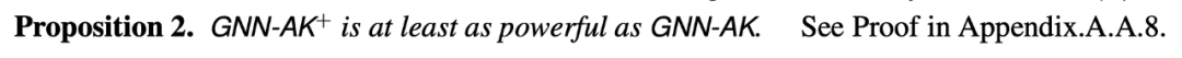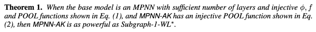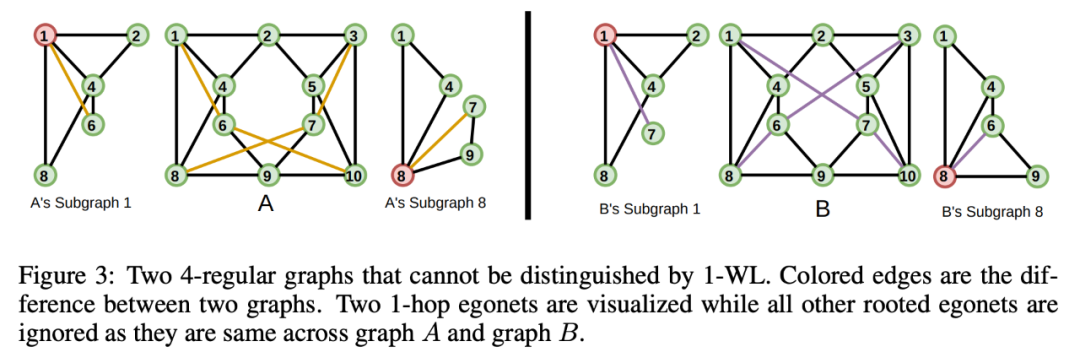 实现的途径是将 MPNN 模型中的星状图替换为如 k-egonets 的子图结构。即某结点的表示将通过其导出子图而不是与其直接相连的邻居所组成的子图(即星状图)来计算。本文通过理论证明,GNN-AK 表达能力强于 1&2-WL,不弱于 3-WL。