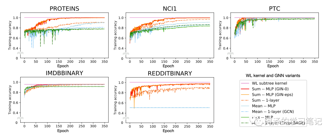 下图为不同条件 GNN 的拟合能力,可以看到 GIN 的最终结果还是比较接近于 ML 的:
