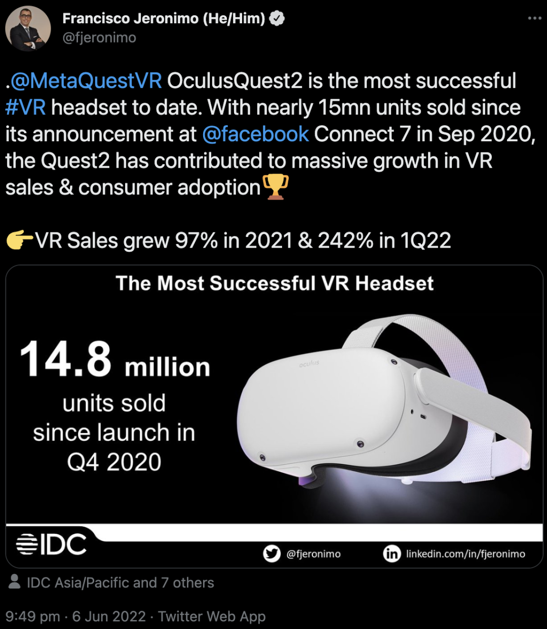 可以说,在2020年推出的Quest 2相当的成功,根据IDC最新的估计,Meta至今卖出了近1500万台。