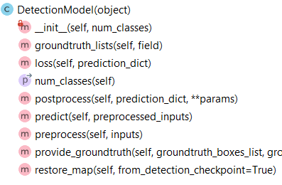 DetectionModel 类结构如下所示,其中 groundtruth_lists 主要包含模型中 groundtruth boxes 的相关信息,loss 用于计算模型 loss 值,num_classes 为要检测的类别数目,postprocess,preprocess 和 predict 如上所述。restore_map 主要用于模型的 fine tuning。