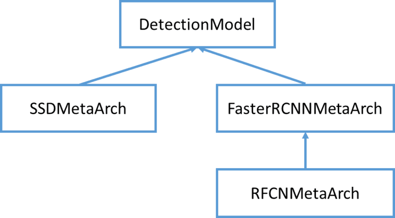 目标检测模型类继承关系如下图所示,其中 RFCN 的模型类似于 Faster RCNN,所以继承自 FasterRCNNMetaArch,主要区别在于模型的第二阶段与 Faster RCNN 模型不同。