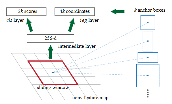 主要思想为:在卷积特征图上,用 3×3 的窗口执行滑动操作。对每个滑动窗口的中心点,选取 k 个不同 scale、aspect ratio 的 anchor。基于 3×3 的滑动窗口大小,scale 和 aspect ratio 映射回原图,生成候选的 region proposals。每个滑动窗口操作同时会生成对应窗口区域的特征编码(源论文中是对应 256 维的低维特征编码)。对该低维的特征编码做两次卷积操作,输出 2×k 分类特征和 4×k 回归特征,分别对应每个点每个 anchor 属于目标的概率以及它所对应的物体的坐标信息。