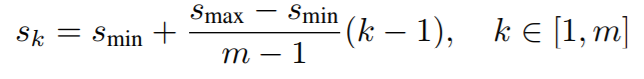 假设使用 m 个不同层的特征图来做预测,最浅层特征图的 scale 值为 scale_min=0.2,最深层特征图的 scale_max=0.9。则每个特征图上 default box 的缩放比例可以由下面公式计算得到: