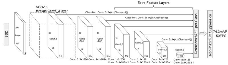 SSD 同 Yolo 一样同样是基于回归方法的深度学习目标检测算法。该网络结构利用了 Faster RCNN 的 anchor box 和 YOLO 单个神经网络检测思路,该网络结构即保留了 Faster RCNN 的准确率又有 YOLO 的检测速度,可以实现高准确率的实时检测。SSD 的网络结构如下图所示: