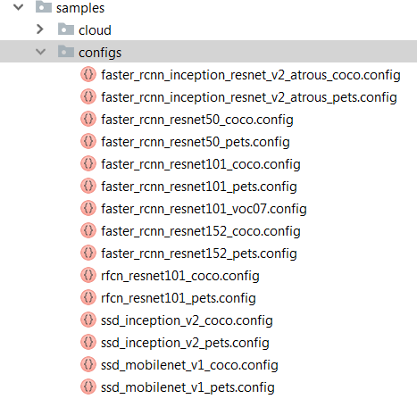 配置文件:目标检测框架通过配置文件配置模型的 train 和 evaluate 参数,并提供了相关模型的示例配置,放在 $object_detection/samples/configs 目录下,文件命名规则为:模型名 - 特征提取网络 - 数据集, 如下所示: