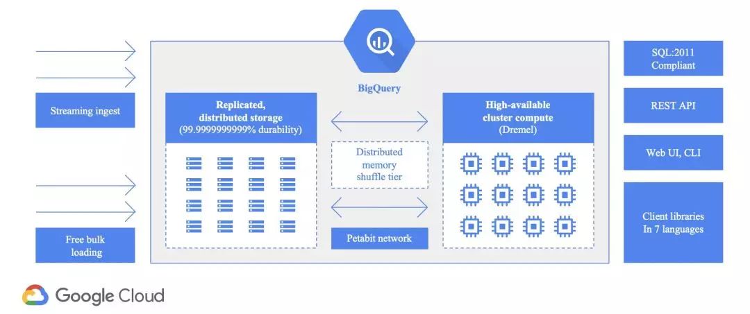 BigQuery 架构同时 BigQuery 架构是一个计算存储分离的结构。计算和存储的分离带来诸多好处,比如自动扩展,在复杂查询场景下,当计算复杂,而涉及的数据并不多的时候,就分配更多的计算资源,当数据量特别大,但是计算相对简单,甚至没有任何计算只是把数据收集起来反馈给用户的时候,就扩展更多的存储资源。