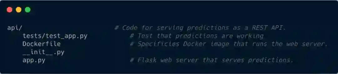 这本质上是为了将最终模型暴露为REST API的端点。它可以包含基本测试,以测试预测是否按照预期的方式进行,即将模型包装到API端点的所需web服务器逻辑。与这些脚本一起,与开发环境的Docker映像相关的所有规范都将驻留在这里。Docker只是我举的一个例子。它可以是任何有助于将软件打包为容器的东西。你会拥有一个生产服务器(如AppEngine、Lambda), API将部署到该服务器。相应的部署脚本也将位于此目录中。