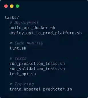 这就是项目中所有的脚本放的地方。这包括检查代码质量的测试、模型预测的测试、部署任务、训练任务等等。