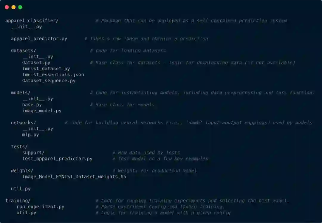 我们必须记住,在这个阶段,将涉及到快速构建原型。作为一个深度学习的实践者,你很可能会尝试不同的网络拓扑结构、不同的损失函数、不同的训练策略等等。机器学习中不存在“免费午餐定理”,这一点在深度学习中更适用。因此,为了确保使用可用的数据训练出一个良好的模型,你可以探索各种可能性和想法。这将导致一些技术债。将有许多文件以无序的方式驻留在项目目录中——重复和冗余的代码、检查点和匿名文件夹中的日志等等。为了解决这个问题,可以遵循一个相对成熟的目录结构。