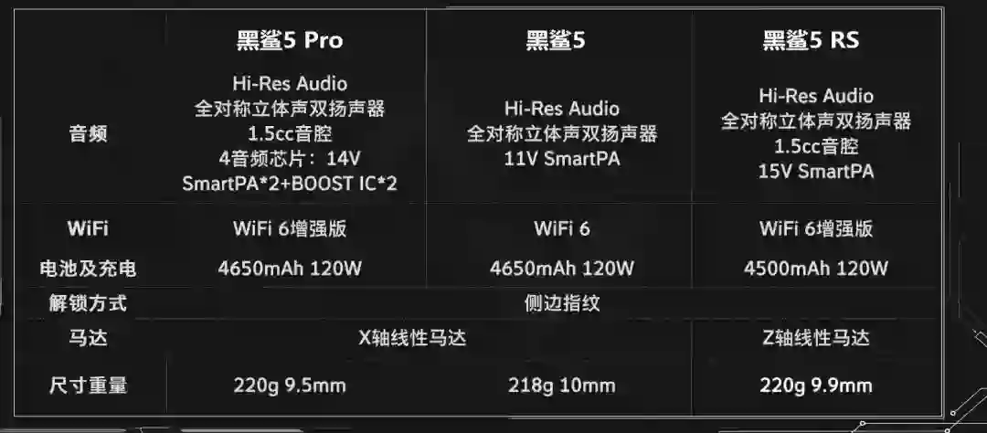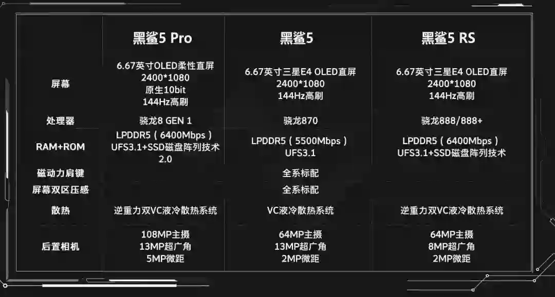 黑鲨 5 系列这次一共发布了三款产品黑鲨 5 Pro、黑鲨 5 以及黑鲨 5 RS 这三个型号,除了处理器不同之外,在一些细节上也有所差异。具体参数大家可以看图。这次咱们聊的主要是黑鲨 5 Pro。