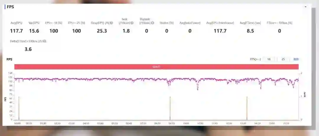 先来跑下国民游戏《王者荣耀》,开启超高刷新率,整个手机的稳定性让人很满意。平均帧率 117.7,整体机身温度温热可以接受,虽然比其他两款带有主动散热的手机热一丢丢。考虑到没有主动散热,可以理解。