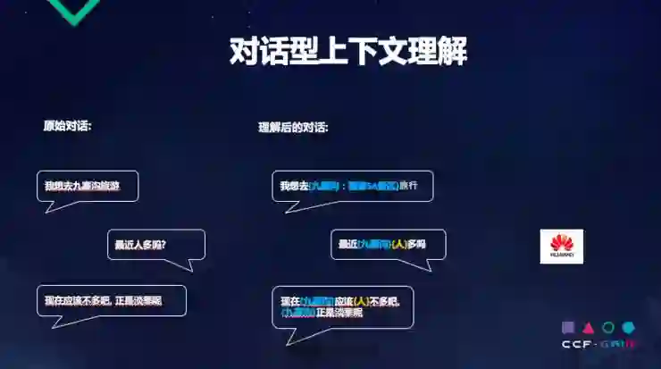 对于对话型的理解其实是更难的问题,因为人们在对话中往往会省略一些大家知道的信息或者以前说过的信息,我们现在用深入学习端到端网络做这件事情,很多时候可以很容易的跟一些传统 NLU 系统做对接,这些 NLU 单元不用太关注上下文的问题,比如这个例子中,说的主体是九寨沟以及人多不多的问题,我们可以对单句进行补全。这个端到端的网络设计了一种类似于机器阅读理解的结构,论文刚刚投出去。