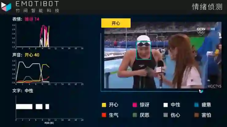 来看一个例子,这是两年前最有名的一段视频,左上角是她的人脸表情,左边的中间是语音情绪,左下角是文字情绪,傅园慧说「在澳洲训练非常辛苦,我已经快死了,简直是生不如死」从文字上来可能是愤怒的。「鬼知道我经历了什么,我太累了」,文字上是辛苦的,但是人脸表情、语音情绪不是,所以总结起来还是开心的。这个视频不管看多少次你都会非常开心。