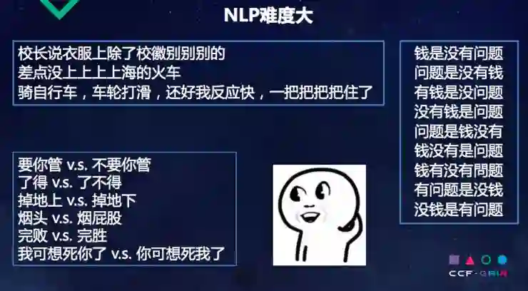 首先说一下 NLP 的特点,NLP 的一大特点是需求非常多,NLP 核心处理语言文字,需求非常广泛。这是各行各业的客户提出的真实需求,任务非常多,这是 NLP 的第一大特点。第二大特点是 NLP 难度非常大,这是我们搜集的分分钟逼死 NLP 从业者的的 CASE,比如「校长说衣服上除了校徽,别别别的」,计算机理解起来会非常难。再比如这首打油诗,字都一样,稍微调换一下顺序,表达的意思就完全不同。中文博大精深,对从业者的挑战非常大。