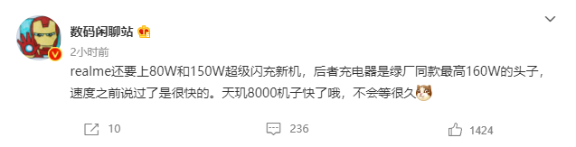 据 @数码闲聊站 爆料,realme 将要上 80W 和 150W 超级闪充新机,后者充电器是OPPO 系同款最高 160W 充电头,这将是目前市场上快充功率最高的手机。目前市面上的高端旗舰最高支持 120W 超级闪充,15 分钟可以充满 4500mAh 电池。即将发布的红魔 7 Pro 支持 135W 超级闪充,15 分钟可以充满 5000mAh 大电池。相较于安卓阵营,苹果 iPhone 这几年在快充方面的进步并不明显,最新的 iPhone 13 系列不过才支持 29W 快充。另外,这几年的三星旗舰最高也仅支持 45W 快充。