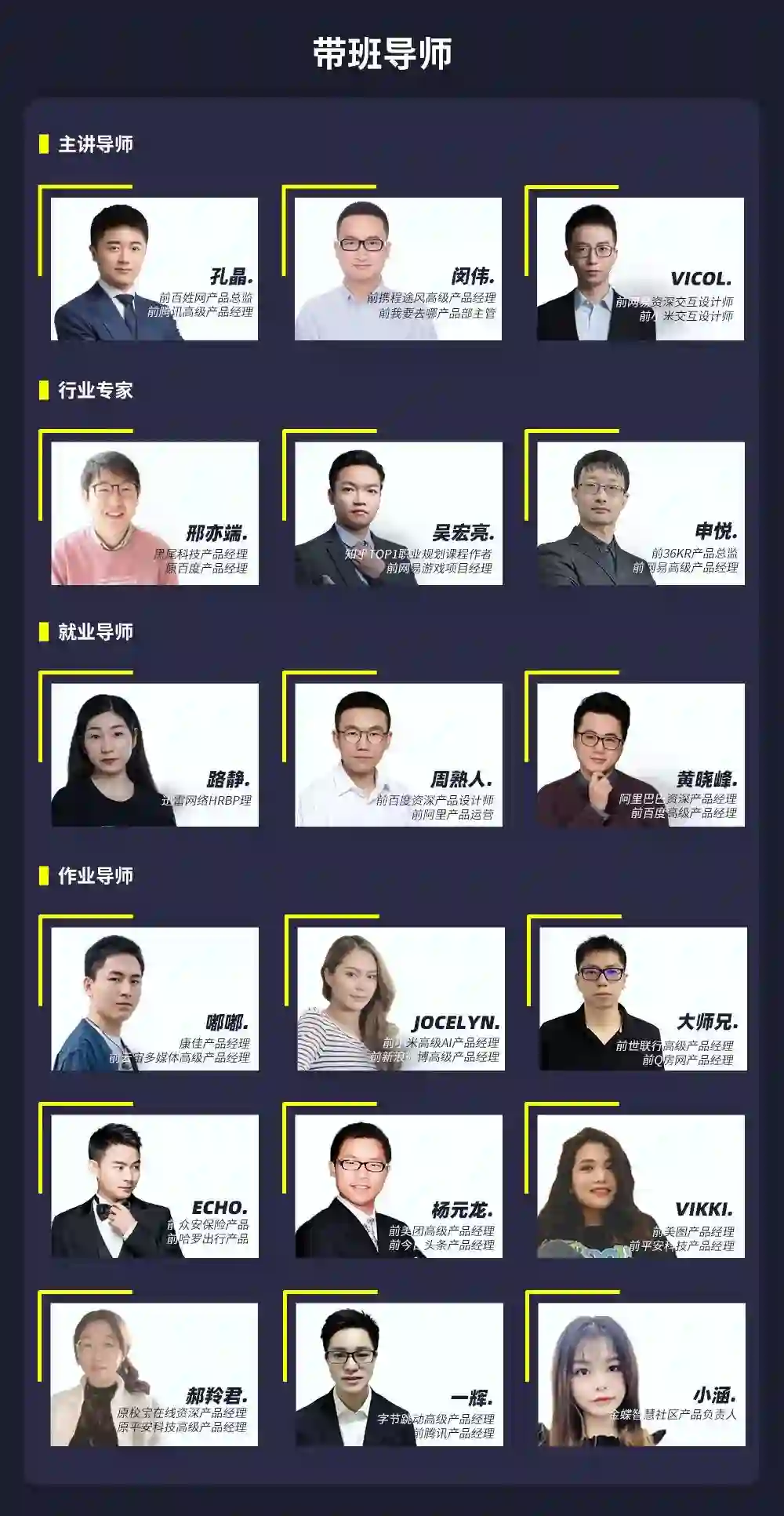课程有资历深厚的BAT级别一线互联网产品导师,来保障你的“教·练·做”,为你带来比其他课程更多、更优质的教学服务——通过200+录播课、N次社群聊一聊、20+直播课、7次作业答疑、4次方向指导、1-6次1V1咨询等服务,将成熟的思维&方法论深入浅出地传授给你。