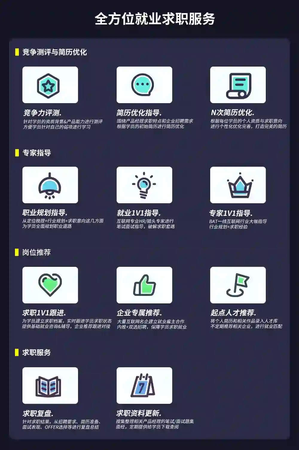 特训营另一个特色在于“就业”,基于企业招聘需求提供11项求职就业服务,由就业服务老师、招聘管家全程为你给你支招,知己知彼打有准备的仗,直到你能拿到Offer,成功入职为止。